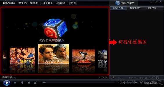 众所周知,很多播放软件,都会在启动之后,将一张图片作为播放窗口的背景。然而,时间一长,就算再漂亮的图片,也会让人生腻。不过,如果您使用的是快播,那么一定就会惊喜地发现。这款软件中的背景,竟然全都是动态的Flash格式,完全是一种可视化效果。每次打开之后,软件会自动从内置的可视化效果中随机进行挑选,用户也可主动进行选择。更惊喜的是,每一种可视化效果都提供了一种互联网服务,可以自由点击浏览。如图8所示。