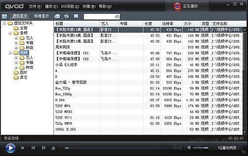 如今,很多软件都设置了媒体库,用以帮助我们更好地管理媒体文件。但由于种种原因,大多数媒体库,都只能提供一些最基本的管理操作。而在快播的媒体库中,我们不仅可以点击“标准显示”,以熟悉的文件夹格式翻阅文件。而且,还可以利用“虚拟显示”标签下,软件所提供的虚拟文件夹,以影音类别、艺人、专辑等多种方式进行查找,十分方便。而位于窗口顶端的快捷查询栏,也为媒体的搜索,带来了不少便利,如图7所示。