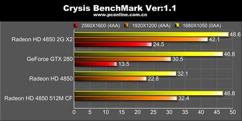 从本次评测来看,Radeon HD 4850 X2跟Radeon HD 4850 CrossFire性能相比提升不是很明显,但是对于单卡Radeon HD 4850提升来看基本达到两倍的提升,得益于2GB显存,Radeon HD 4850 X2在高分辨率成绩完胜GTX 280,例如孤岛危机提升明显。总的来说Radeon HD 4850 X2完全有挑战GTX 280的资格,无论从成本还是其性能上面。