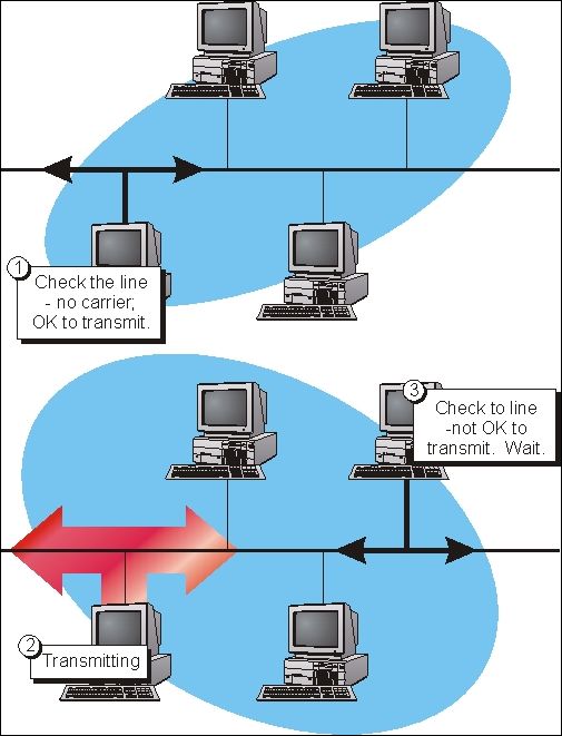 我们来看一下,假设A检测到网络是空闲的,开始发数据包,尽力传输,当数据包还没有到达B时,B也监测到网络是空闲的,开始发数据包,这时就会发生碰撞,B首先发现发生碰撞,开始发送碰撞信号,所谓碰撞信号,就是连续的01010101或者10101010,十六进制就是55或AA。这个碰撞信号会返回到A,如果碰撞信号到达A时,A还没有发完这个数据包,A就知道这个数据包发生了错误,就会重传这个数据包。但如果碰撞信号会返回到A时,数据包已经发完,则A不会重传这个数据包。