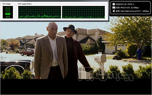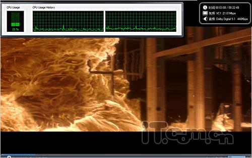 VC1测试使用《黑客帝国》,平均码率在20Mpds左右,由于9800GT和geForce 8/9系列一样,不具备VC1的完全解码能力,所以影片播放时占用一定的CPU资源,CPU占用率在10%到15%。