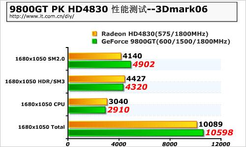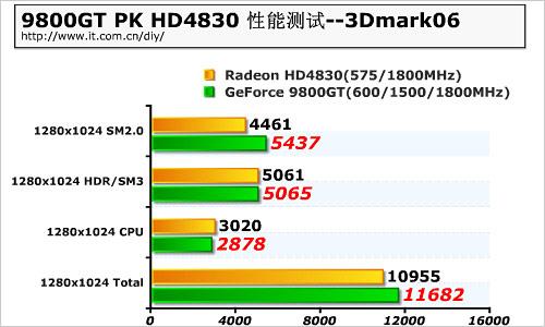 3DMark06虽然较老,可实际上却代表着目前游戏特效以及游戏主流引擎的总体方向。在这里9800GT可谓是如鱼得水,较之HD4830来说,性能提升相当明显。