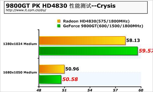 Crysis也是比较老的游戏了,可是在中等细节下,也拥有相当不错的画质,在这一画质下,9800GT依然超越HD4830,拥有更好的性能表现。