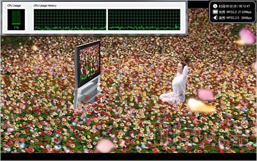 MPEG2测试使用松下的试机片,码率在20Mbps左右,可以看到播放过程CPU占用率都在10%以下,完全使用用GPU解码。