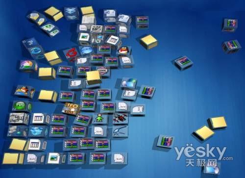 下载后直接运行,你的桌面图标即刻就会变成3D方块了,那么究竟怎么来玩这些图标呢?看哪个图标不顺眼,你可以直接拖动鼠标将它扔到桌面角落去,当然它也会乖乖听你的话照办。桌面图标也有点像太空中失重的漂浮物一般,因此你也可以拖动一个图标方块去碰撞其他方块,其他图标方块就会飘起来。如果有兴致,你甚至可以像玩搭积木般将方块叠成高塔。同时由于重力的作用,塔很快就会倒塌的,非常有趣(如图)。