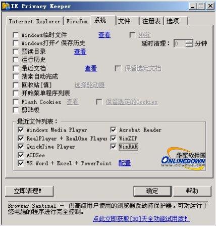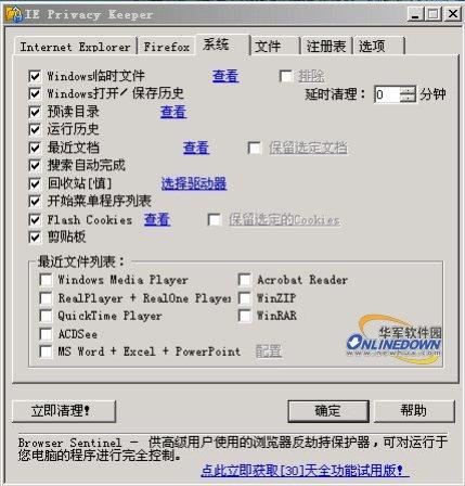 4.IE Privacy Keeper可以清理的Windows系统文件包括:Windows临时文件、Windows打开/保存历史、预读目录、运行历史、最近文档、搜索自动完成、回收站、开始菜单程序列表、FlashCookies等;