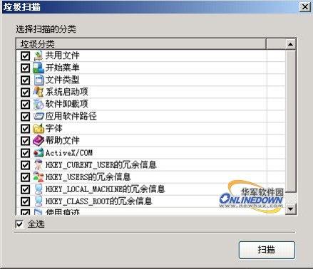 4. 全能助手Windows优化王可以清理的注册表垃圾包括公用文件、开始菜单、文件类型、系统启动项、软件卸载项、应用软件路径、字体、帮助文件、ActiveX/COM等;