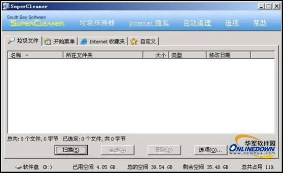 初一看SuperCleaner其貌不扬,同时功能设计上也相对较为繁琐,当然SuperCleaner提供的功能确实蛮多的,该软件特色包括:清除搜索历史;使用安全;保护互联网隐私;保持硬盘清洁;防止文件恢复;清理您的收藏夹;保持开始菜单清洁;自动化清理。