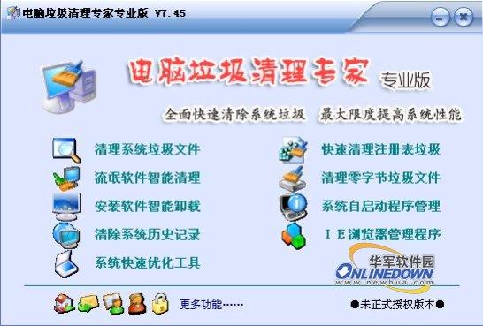 电脑垃圾清理专家是一款清理windows系统垃圾信息或者垃圾文件的强大的傻瓜式软件。它可以清理各种注册表垃圾信息、网络垃圾,网络痕迹,系统垃圾文件和各种软件安装卸载所残留的垃圾。用户只需在主界面选择要清理的项目即可,按照提示即可轻松完成清理工作。该软件全面支持98、Me和所有的基于NT内核的Windows系统,包括NT/2000/XP/2003,支持FAT32 和 NTFS文件系统。
