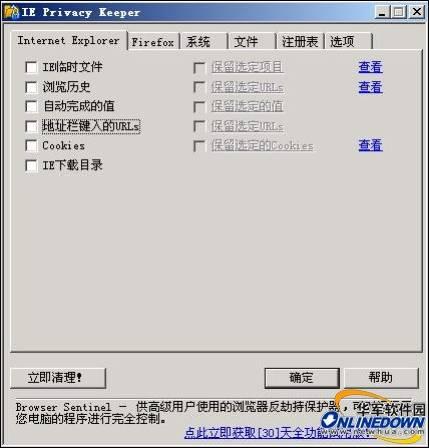 IE Privacy Keeper的界面显得很粗糙,但是有一个亮点就是几乎90%的功能都带有详尽的悬停提示,另外,它的下方是广告,内容都是该软件开发商旗下的其它软件,如果你有兴趣可以去看一看,没兴趣就别理会它。