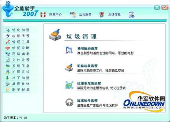 全能助手Windows优化王的界面很漂亮,其垃圾清理界面更是实实在在,从Windows的历史记录到IE的上网记录,从磁盘垃圾文件到注册表垃圾,从流氓软件到广告插件等等各种垃圾的清理,优化王都提供全面的解决方案,加上独有的后台清理,原来垃圾清理可以这么简单。