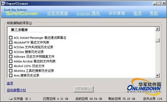 2.SuperCleaner可清理的应用程序很多,包括:ACDSee历史记录,Adobe Reader最近的文件列表,Google工具栏搜索历史,WinRAR最近文件列表,Sun Java缓存,RealPlayer最近文件列表和历史记录等24种;