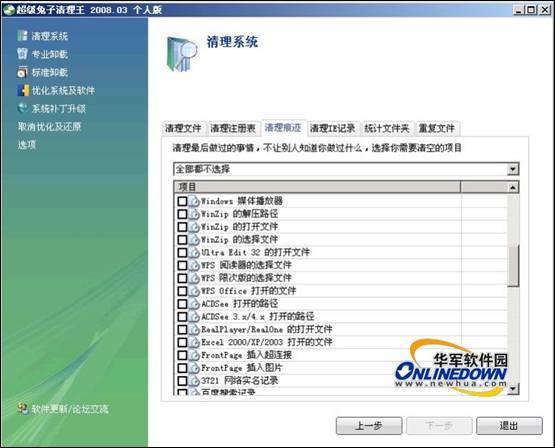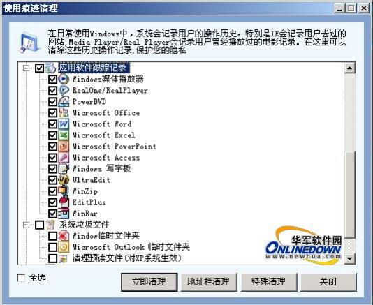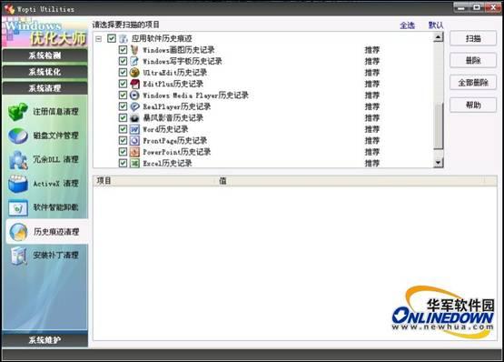 6. 全能助手Windows优化王可以清理以下应用软件的使用记录,包括:Window MediaPlayer、RealPlayer/RealOne、Microsoft Office、Windows写字板、WinRAR、WinZip等十余种;