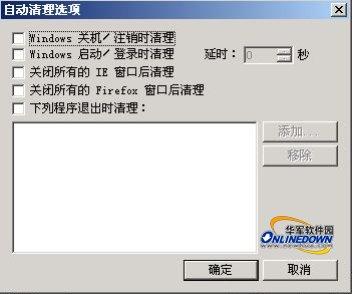 4.IE Privacy Keeper可以设定在系统关机/注销时自动清理,或者在系统启动/登录时自动清理,或者关闭所有IE窗口后自动清理,或者关闭所有的Firefox窗口后自动清理,或者自定义退出某个程序时自动清理,如图所示: