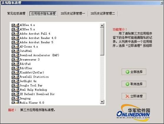 5. 电脑垃圾清理专家可以清理的应用程序包括:ACDSee、Adobe Reader、Dreamweaver、Google Toolbar、Window MediaPlayer、RealPlayer/RealOne、Office、Photoshop、WinZip、WinRAR等50多种;