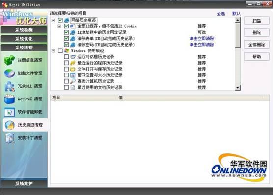 7. Windows优化大师只支持IE浏览器,可清理的项目包括:IE历史记录、Cookies、地址栏中的网址记录、自动完成历史记录等;