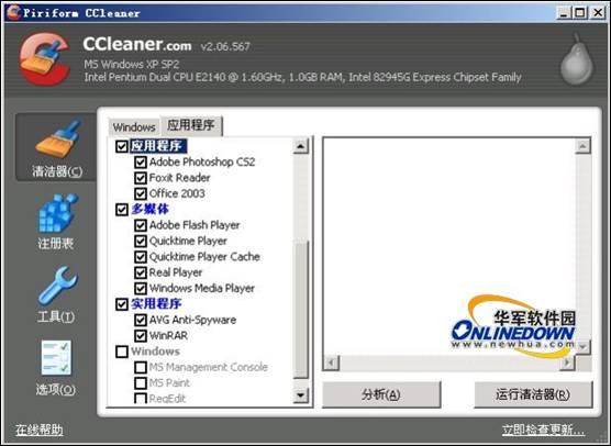 1.CCleaner在列表中显示的能够清理的应用程序,是本机已安装的软件,每台机子安装的应用软件不同,可清理的部分也不同,如在小编的机子上可以清理的应用程序包括:Adobe Photoshop CS2、Foxit Reader、Office 2003以及使用以下多媒体播放器Adobe Flash Player、QuickTime、RealPlayer和Windows MediaPlayer等10种;