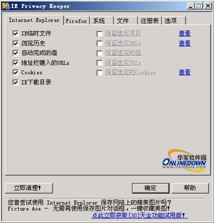 IE Privacy Keeper既可清理IE及基于IE的第三方浏览器的上网痕迹,也可针对Firefox浏览器进行清理,同时它也可以对系统其他名目繁多的垃圾文件进行清理,包括Windows临时文件、Windows打开或保存历史、预读文件、运行历史、最近文档、搜索记录、自动完成、回收站、开始菜单程序列表、剪贴板等。另外还支持清理常用软件的使用历史,如Windows Media Player、RealPlayer/RealOnePlayer、Adobe Reader、WinZip、WinRAR、ACDSee、MS Office等。