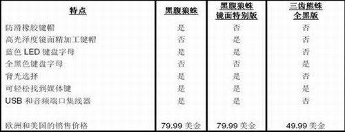 部分看点:Razer黑腹狼蛛镜面特别版游戏键盘比原来Razer黑腹狼蛛键盘性能更好,是旧版的升级版。相比旧版,Razer黑腹狼蛛镜面特别版拥有高光泽度镜面精加工键帽,并为满足夜间玩游戏的需要增强了背光。曾经荣获大奖的Razer黑腹狼蛛仍将在所有主要电子零售商处销售,Razer 黑腹狼蛛镜面特别版将于2008年12月上市。