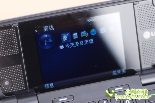 在外屏幕上我们可以看到该机的六大功能项目:名片夹、写信息、照相/摄像、通话记录、收件箱、音乐,能实现的只有后面四项,而名片夹和写信息则需要翻盖侧盖进行操作。显而易见,通话记录的查询功能非常实用,但是在外屏上没法查询名片夹,会在拨号时很不便利,好在翻开侧滑盖状态下也可以拨号。