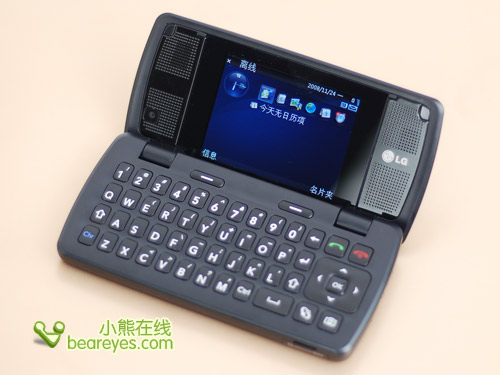 也许在KT610合盖状态下看它确实平淡无奇,但是开盖后就大为不同,看到2.4英寸的显示屏幕,两侧对称分布的立体声扬声器,以及下面整个机身上的QWERTY全功能键盘。