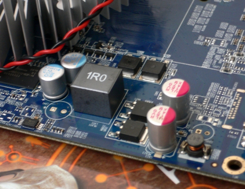 在供电方面,蓝宝石HD4650海外版同样出手阔绰,核心显存分别采用各自独立的供电系统,核心使用了4只TO252封装Mosfet与4颗固态电容和全封闭电感,上下桥各采用双Mosfet并联分担负载,在性能上能媲美两相供电。显存供电也使用了两颗相同规格的Mosfet与NCC优质电解电容,为显存供电提供强力保证。
