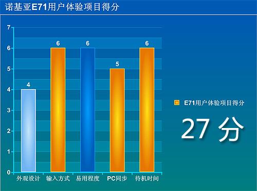 也许由于稳定性上的原因,诺基亚并没有为定位商务的E系列配备最新系统,因此E71的S60第三版FP1平台便无法像N96一样加分了。从智能手机的角度上看,E71的S60标准界面十分乏味,也缺少时髦的功能,我们只能给3分的不及格分数。