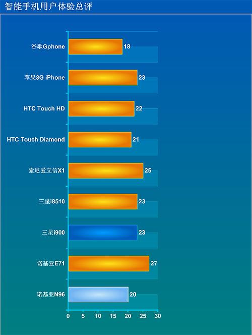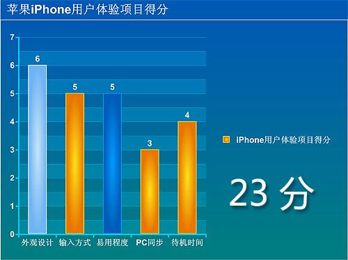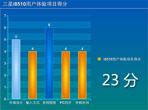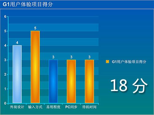 使用体验测试部分共30分,分“外观设计”“输入方式”“易用程度”“PC同步”“待机时间”等五个小项对手机进行打分,每小项满分6分。