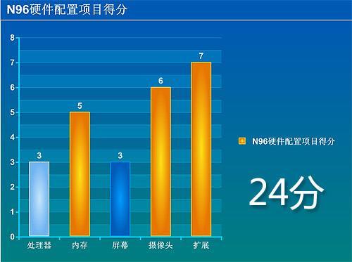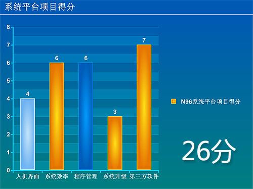 随着PALM逐渐淡出,Symbian S60智能平台已经成为了效率最高的智能操作系统,N96的FP2版本虽然在效率上比之前并没有提升,但依然可以获得6分的高分。