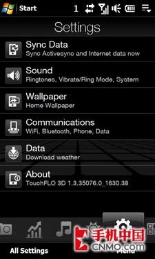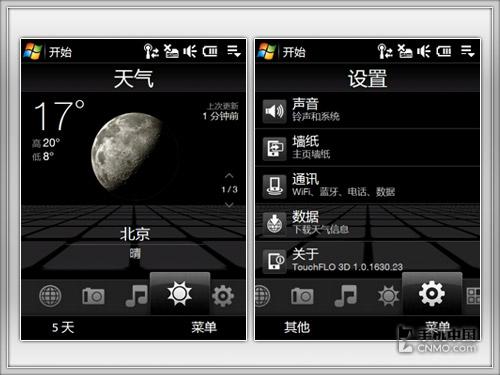 HD同样内置了Touchflo3D界面,全新升级的Touchflo软件界面在WVGA屏幕上表现更加出色。横向的主要功能浏览,每触摸一个图标就会出现相应的动态切换效果。联系人界面令人惊叹,每个联系人可以设定一张图片,一张一张翻开,好像真实的号码簿。而一个简单的天气界面,晴天、阴天、雷雨等,都使用了非常漂亮的3D动态效果表现,十分漂亮。