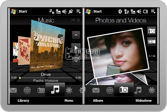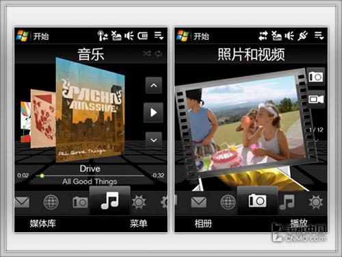 Diamond的一举成名Touchflo3D的功劳不小,全新升级的Touchflo软件界面非常简洁、美观,每一个图标都经过精心设计。横向的主要功能浏览,每触摸一个图标就会出现相应的动态切换效果。联系人界面令人惊叹,每个联系人可以设定一张图片,一张一张翻开,好像真实的号码簿。而一个简单的天气界面,晴天、阴天、雷雨等,都使用了非常漂亮的3D动态效果表现,十分漂亮。
