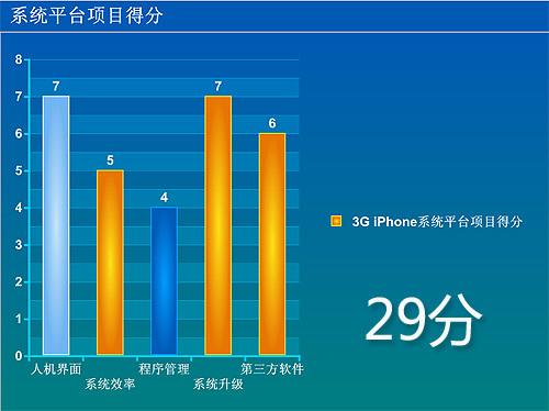 笔者一直以来都是一个Windows mobile系统的标准玩家,但iPhone的出现改变了我都智能手机以及智能操作平台的一贯看法。优秀的图形化界面和直观的多点触摸操作让3G iPhone使用起来更舒适,当然也可以说是更“智能”;商业化的软件平台更是在短短一年的时间内,几乎超越了WM系统数年的软件积累,在系统平台上3G iPhone得到最高评价相信会有很多人信服。