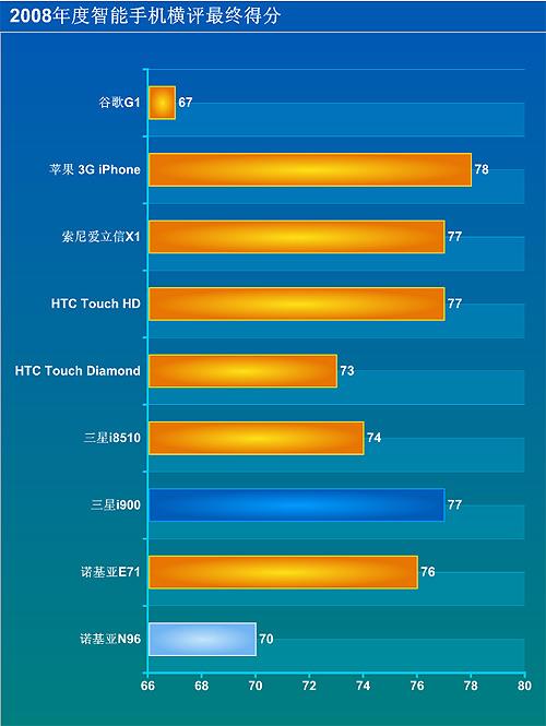 经过三轮15个项目的激烈比拼,最终苹果3G iPhone凭借着均衡的表现以及在系统平台上的明显优势取得了最高分数,并一举夺得了手机中国2008年度智能手机横向评测的“年度最佳智能手机”大奖。此外,索尼爱立信X1、HTC Touch HD、三星i900三款Windows mobile系统的智能手机以相同分数紧逼榜首,这也让我们看到了微软积聚的丰厚实力。