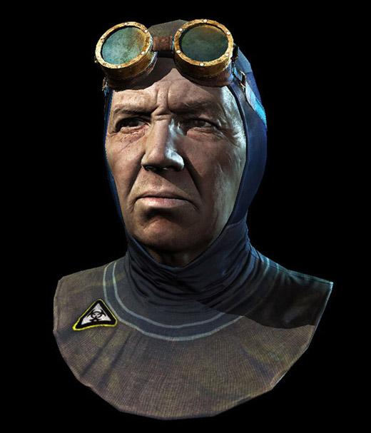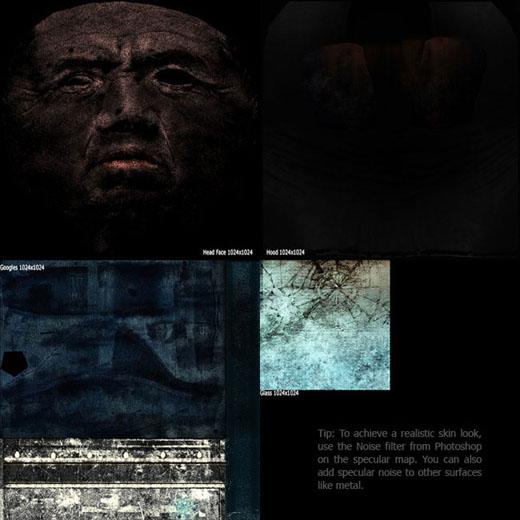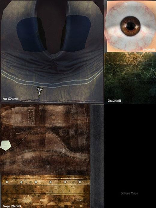帽兜和风镜,我在Photoshop里用普通贴图和环境吸收贴图为起点建立材质。表面的细节用编织样式和皱的纸这样的材质来达到看起来破旧、使用过的感觉。风镜使用不同的样式来定义铜、皮革和破损的镜片。我还添加了一些污渍效果,已增强风镜的视觉效果。