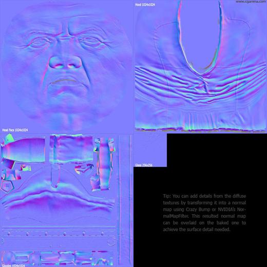 反射贴图在基于色彩贴图的基础上建立。我重新将图片去饱和,这样能得到一个不错的灰度图。高光部分,我增强了亮度,有时候接近白色。对于一些材料(比如金属),把色彩弄成色彩贴图的补充部分,效果会好的多。我知道如果在反射贴图里添加了太多对比度,会让角色在近距离看起来不真实。但是这个效果会很棒,当从中间距离看的时候,角色的视觉效果增强了。为了给反射贴图来点变化,我用了"污渍"贴图。而且,我尝试让反射贴图多样化。例如,我定义帽兜由两种不同材料做成,然后给它们的2个区域不同的反射色彩。