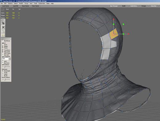 下一步是帽兜。我用与头部一样的工作流程。脖子部分是特别难的地方。因为要找到这样的帽兜很难。这里就要引入调整这个概念。记住,让每样东西看起来尽可能真实。