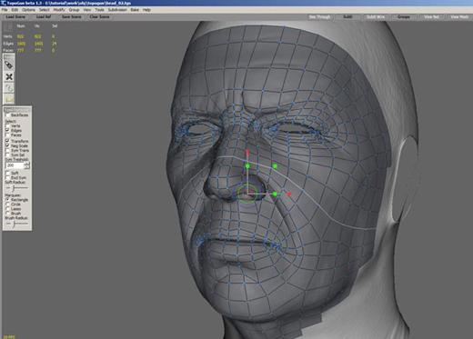 这一阶段可以在几乎所有3D软件里完成。你能用Zbrush Topology或者Maya Live来制作。我用的是Topogun,由我一个同事Cristi Prefac开发的软件。Topogun能让我恢复整个低多边形模型的拓扑图而且能处理从另外一个高分辨率模型转到底分辨率模型的普通贴图,周围吸收和色彩贴图。我预计用4500个三角形。这样,人物面部就有了许多的几何体来构成。