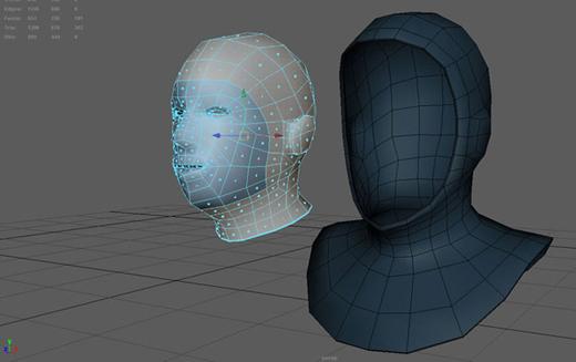 用一个黑色的着色器(Maya里的Surface Shader)来生成轮廓。感觉满意后,我开始着手建立帽兜的模型。这个帽兜的样子由头部决定。我从提取出之前头部形状的一部分来作为帽兜的几何形状。有一点非常重要,那就是帽兜应该保留头部一开始的样子,这样一来,缝隙上就不存在问题了。特别是头部隐藏的部位被删除的时候。