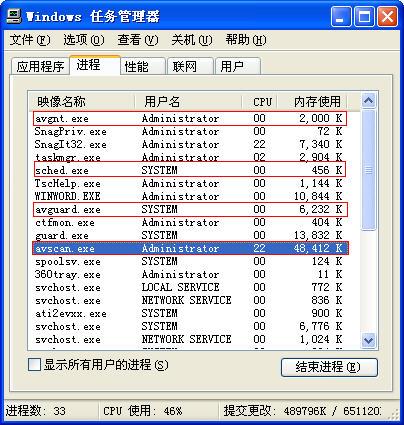 而进行扫描任务时,小红伞将又开启一个扫描进程avscan.exe,此时的系统资源占用情况相对静默状态时的资源占用明显就大多了,CPU占用在20-90%之间,内存占用也或高或低,下图所示时刻四个进程加起来的内存占用超过了50M,此时老机用户使用起来可能稍显吃力。