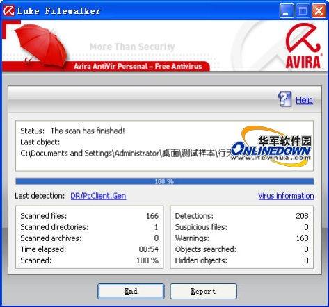 为了对比小红伞和卡巴斯基的检测能力到底有多少差距,小编将病毒包解压然后再一次用小红伞进行扫描,这样小红伞将具体扫描压缩包中的每一个文件,从而我们可以查看小红伞到底检测出这个病毒包内有多少病毒了,检测结果见下图,小红伞共扫描文件166个,其中检测到病毒163个。