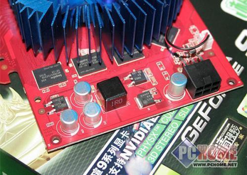 作为499元新秀王者,铭瑄9600GSO黄金版不但拥有强劲性能,在做工用料上也是相当优秀,保持一贯的高水平制作。核心独立2相供电,每相供电搭配3颗高品质MOS管,有效保证电流的纯净,为核心提供充足电力。整卡清一色采用日本化工PS系列固态聚合物电容,搭配全封式陶瓷电感,能够带来更好的超频性以及稳定性。为了确保显卡供电,9600GSO同样需要外接6pin电源。