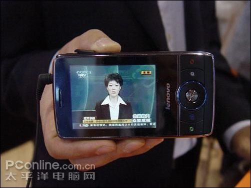 联想ET880最大的特点就是它是是一款内置CMMB模块的Windows Mobile智能手机,用户可以通过这款产品免费观看八个频道的电视节目。在待机状态下按导航键左侧的“TV”电视快捷键即可激活电视功能,进入电视功能后便可以直接观看节目,操作非常简单,而且它还支持节目录制、实时截屏、电视节目向导等众多个性化的功能,比其他CMMB电视手机要强大不少。