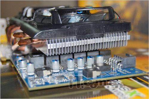 供电部分,采用了4+2相供电设计,四相核心供电(每相3Mos管,一共12颗,满载时降低元件温度)、两相显存独立供电,使用高品质的日化固态电容和铁素体防磁电感,并经过QC人员逐一检查,确保完美品质。显卡最出众之处在于使用了瑞士名牌Arctic Cooling“Twin Turbo”散热器,大大提升了整体散热水准,双8CM静音风扇兼顾显存、供电模块等元件散热,而且仅重360G对PCB变形压力非常低,四条6MM铜质热管把核心热量快速传递到30片薄鳍片中,满载温度远比公版要低。