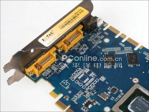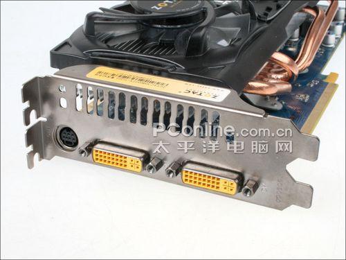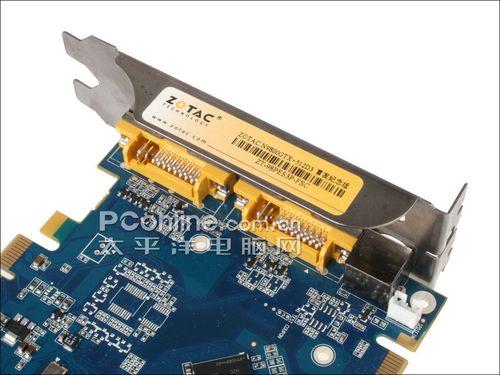 该显卡显示输出提供双DVI+S端子,档板占用两条PCI插槽档板,其中一条预留排气孔,能配合显卡散热器将热浪排出机箱外,并且在档板上采用了镀镍处理,有效防止氧化腐蚀。