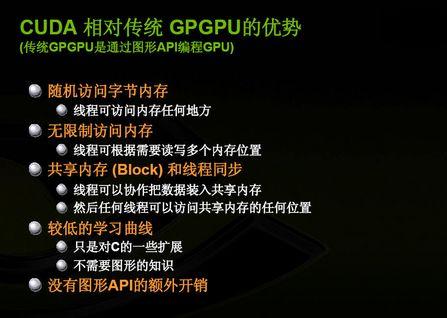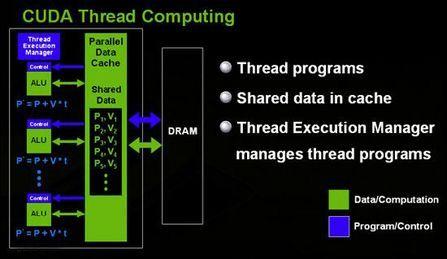 CUDA(Compute Unified Device Architecture)是一个新的基础架构,这个架构可以使用GPU来解决商业、工业以及科学方面的复杂计算问题。跟以往的GPGPU概念不同的是,CUDA是一个完整的解决方案,包含了API、C编译器等,能够利用显卡核心的片内L1 Cache共享数据,使数据不必经过内存-显存的反复传输,shader之间甚至可以互相通信。对数据的存储也不再约束于以往GPGPU的纹理方式,存取更加灵活,可以充分利用stream out特性。以上几点都将大大提高GPGPU应用的效率。例如,在游戏中我们可以使用CUDA来让GPU承担整个物理计算,而玩家将会获得另他们感到惊奇的性能和视觉效果。另外,用于产品开发和巨量数据分析的商业软件也可以通过它来使用一台工作站或者服务器完成以前需要大规模的计算系统才能完成的工作。这一技术突破使得客户可以任何地方进行实时分析与决策。同时,一些以前需要很先进的计算技术来达到的强大计算能力的科学应用程序,也不再受限在计算密度上;使用CUDA的计算可以在现有的空间里为平台提供更强大的计算性能。CUDA采用C语言作为编程语言提供大量的高性能计算指令开发能力,使开发者能够在GPU的强大计算能力的基础上建立起一种效率更高的密集数据计算解决方案。