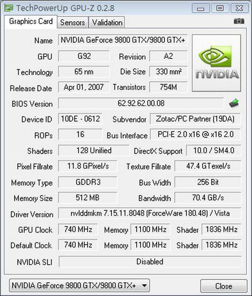 显卡核心方面采用的是台湾台积电OEM的G92-420-B1,就是Geforce 9800GTX+。