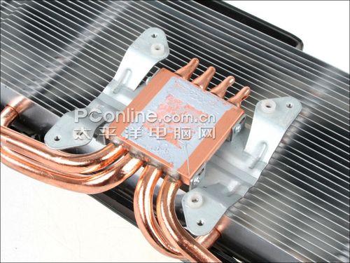 显卡特别之处在于采用了瑞士Arctic Cooling“Twin Turbo”散热器,双8CM的静音风扇兼顾显存、供电模块等元件散热。底座和热排采用四根6mm热管通过穿fin直接贯穿于鳍片之中,热传递非常快速,热排共有30片鳍片,总散热面积约2700cm2,巨大的散热面积保证低转速下也能高效散热。