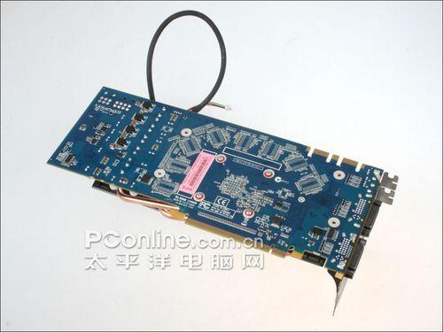 “Twin Turbo”挡住了整块N9800GTX+,我们现在就将他拆下,让大家一看究竟。 首发纪念版采用公版设计,海蓝色的PCB板,用料全是耐用的日化全固态电容与全封闭线圈设计。