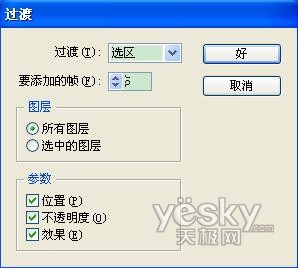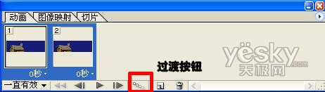 在动画调板中,按住Shift键将A、B两帧一并选中,单击动画调板中的过度按钮,便会跳出过度设置对话框。