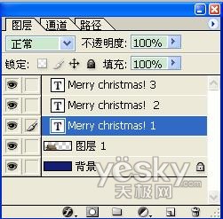 使用文字T工具,在图像右上角添加文字“Merry Christmas!”,并将文字图层复制两个,并将3个图层依次命名为Merry christmas!1、Merry christmas!2和Merry christmas!3。